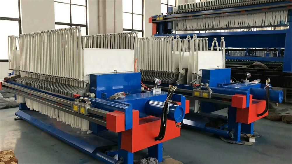 液壓廂式壓濾機(jī)由交替排列的濾板和濾框構(gòu)成一組濾室。濾板的表面有溝槽,其凸出部位用以支撐濾布。濾框和濾板的邊角上有通孔,組裝后構(gòu)成完整的通道,能通入懸浮液、洗滌水和引出濾液。板、框兩側(cè)各有把手支托在橫梁上,由壓緊裝置壓緊板、框。板、框之間的濾布起密封墊片的作用。由供料泵將懸浮液壓入濾室 在濾布上形成濾渣,直至充滿濾室。濾液穿過濾布并沿濾板溝槽流至板框邊角通道,集中排出。過濾完畢,可通入清洗滌水洗滌濾渣。
