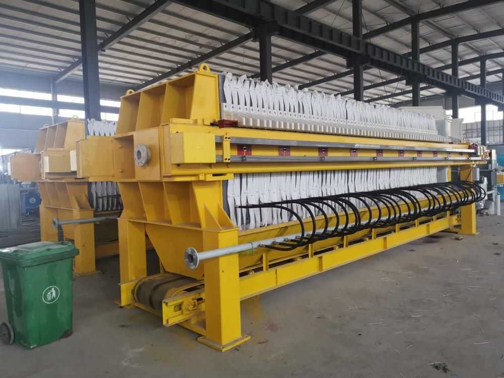 隔膜壓榨壓濾機(jī)是由隔膜板和廂式濾板排列組成濾室,在輸料泵的壓力作用下將料漿輸入濾室,通過過濾介質(zhì)(濾布)將料漿中的固體和液體分離,當(dāng)料漿中的固體形成餅后,再向隔膜通入空氣,對(duì)濾室內(nèi)的固體充分壓榨。
